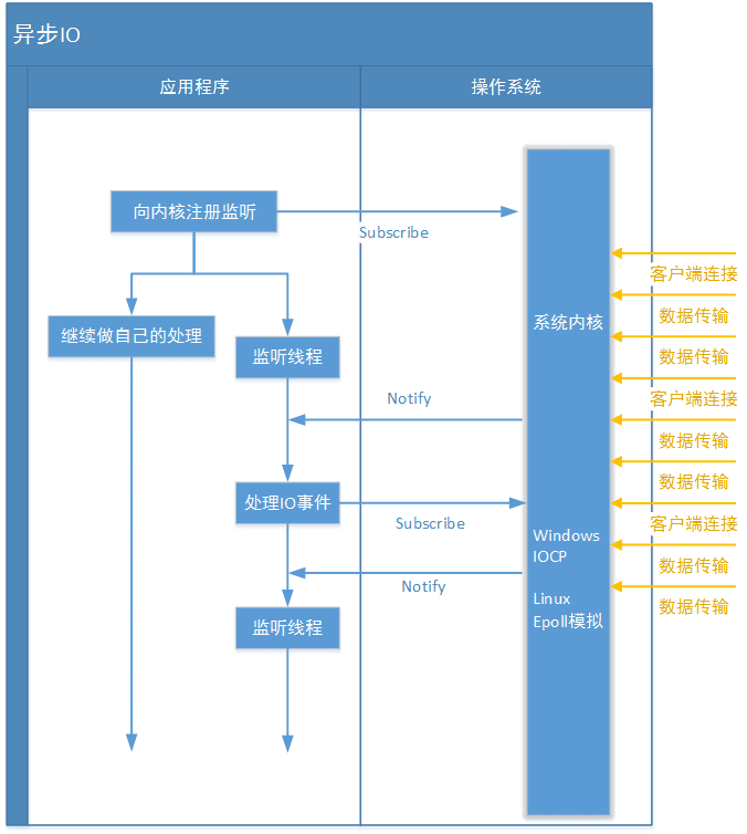 异步IO则是采用“订阅-通知”模式: 即应用程序向操作系统注册IO监听,然后继续做自己的事情。当操作系统发生IO事件,并且准备好数据后,在主动通知应用程序,触发相应的函数: