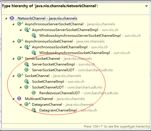 特别说明一下,请注意图中的“java.nio.channels.NetworkChannel”接口,这个接口同样被JAVA NIO框架实现了,如下图所示: