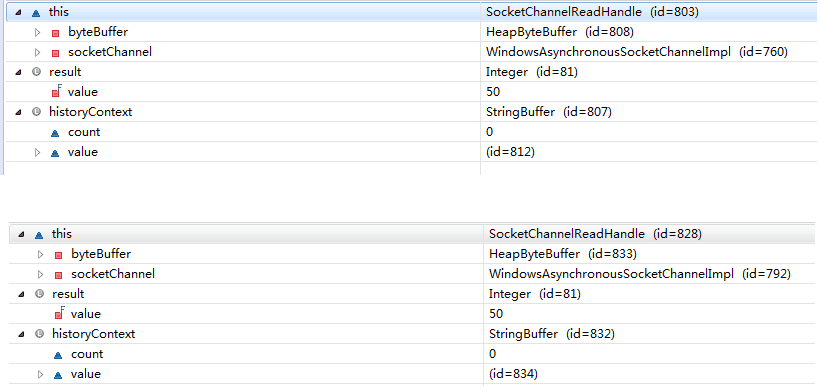 客户端2: WindowsAsynchronousSocketChannelImpl: 792 | FileDescriptor: 797 | SocketChannelReadHandle: 828 | HeapByteBuffer: 833