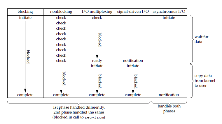前四种 I/O 模型的主要区别在于第一个阶段,而第二个阶段是一样的: 将数据从内核复制到应用进程过程中,应用进程会被阻塞。