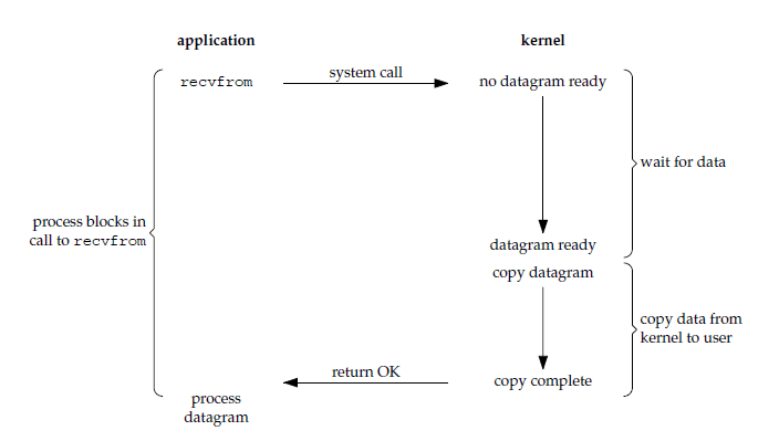 • 同步 I/O: 应用进程在调用 recvfrom 操作时会阻塞。