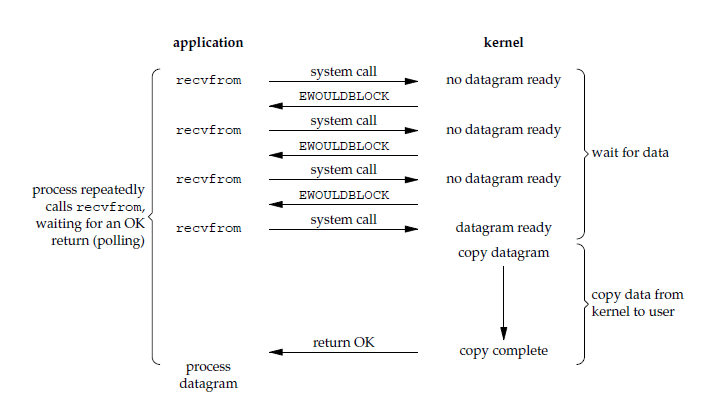 应用进程执行系统调用之后,内核返回一个错误码。应用进程可以继续执行,但是需要不断的执行系统调用来获知 I/O 是否完成,这种方式称为轮询(polling)。