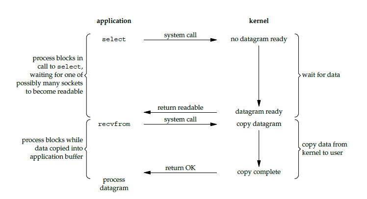 对于一个套接字上的输入操作,第一步通常涉及等待数据从网络中到达。当所等待分组到达时,它被复制到内核中的某个缓冲区。第二步就是把数据从内核缓冲区复制到应用进程缓冲区。