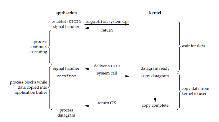 应用进程使用 sigaction 系统调用,内核立即返回,应用进程可以继续执行,也就是说等待数据阶段应用进程是非阻塞的。内核在数据到达时向应用进程发送 SIGIO 信号,应用进程收到之后在信号处理程序中调用 recvfrom 将数据从内核复制到应用进程中。