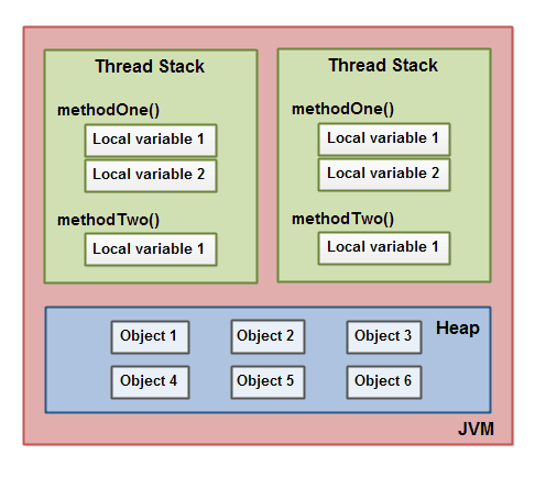 堆包含了在Java应用程序中创建的所有对象,无论创建该对象的线程是什么。 这包括基本类型的包装类(例如Byte,Integer,Long等)。 无论是创建对象并将其分配给局部变量,还是创建为另一个对象的成员变量,该对象仍然存储在堆上。