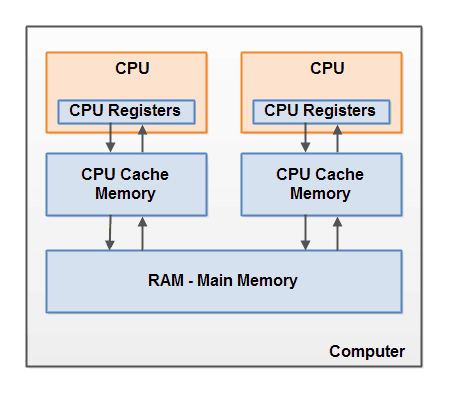 想象一下,共享对象最初存储在主存储器中。 然后,在CPU上运行的线程将共享对象读入其CPU缓存中。 它在那里对共享对象进行了更改。 只要CPU缓存尚未刷新回主内存,共享对象的更改版本对于在其他CPU上运行的线程是不可见的。 这样,每个线程最终都可能拥有自己的共享对象副本,每个副本都位于不同的CPU缓存中。