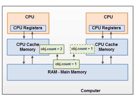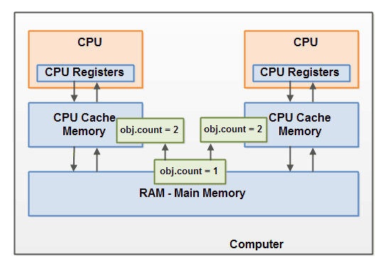 下图描绘了该情况。 在左CPU上运行的一个线程将共享对象复制到其CPU缓存中,并将其count变量更改为2.对于在右边的CPU上运行的其他线程,此更改不可见,因为计数更新尚未刷新回主内存中.