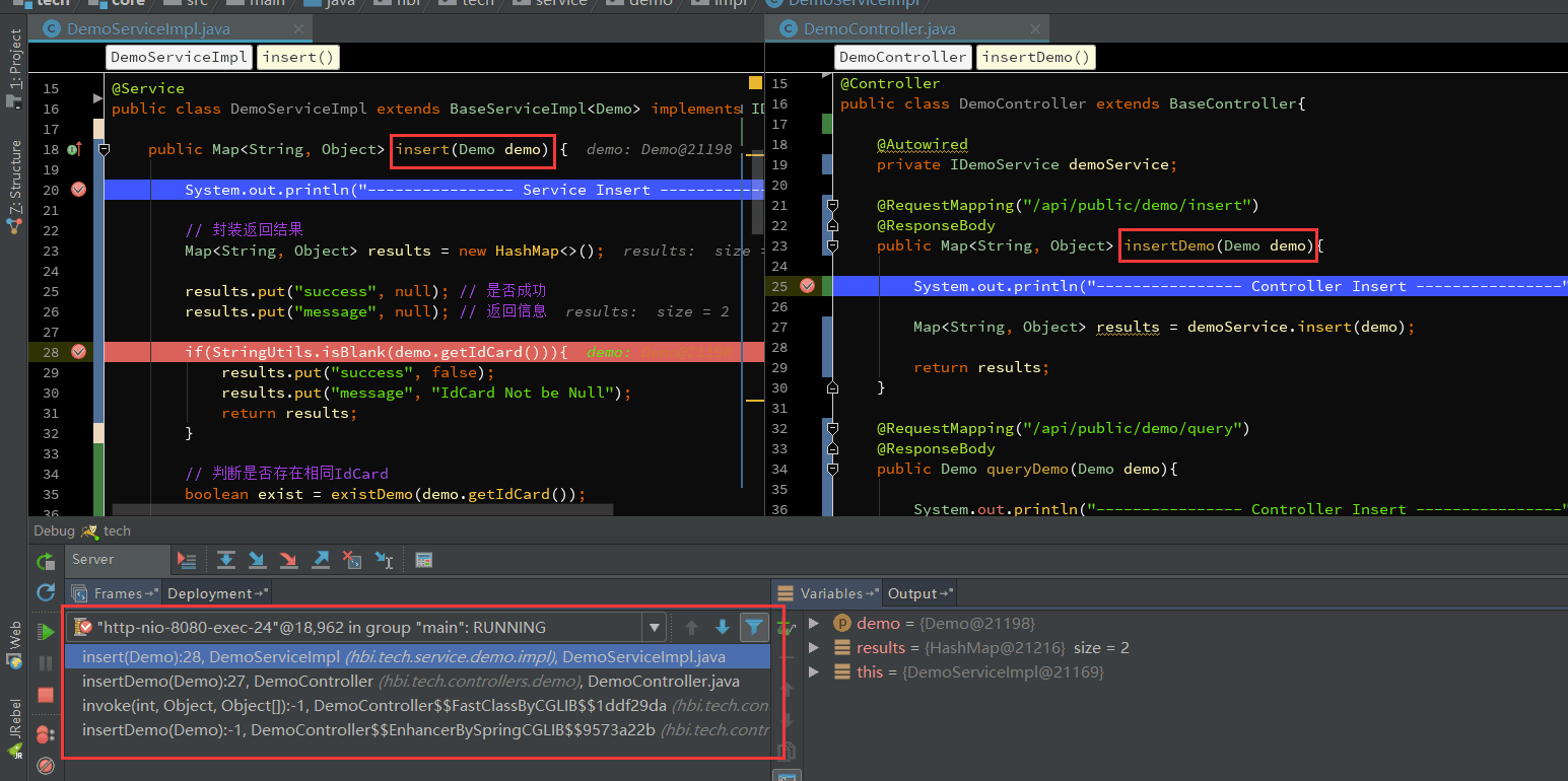 • 首先认识下这个方法调用栈,如图首先请求进入DemoController的insertDemo方法,然后调用insert方法,其它的invoke我们且先不管,最上面的方法是当前断点所在的方法。