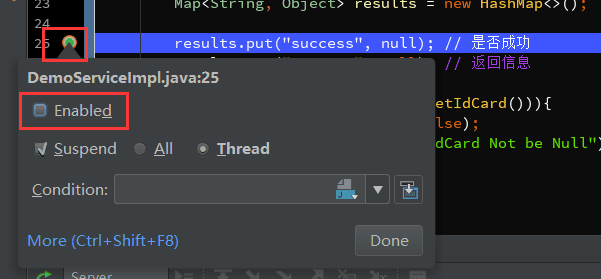 • Java Line Breakpoints 显示了所有的断点,在右边勾选Condition,设置断点的条件。