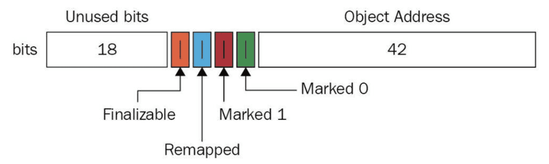 与上述地址空间划分相对应,ZGC实际仅使用64位地址空间的第041位,而第4245位存储元数据,第47~63位固定为0。