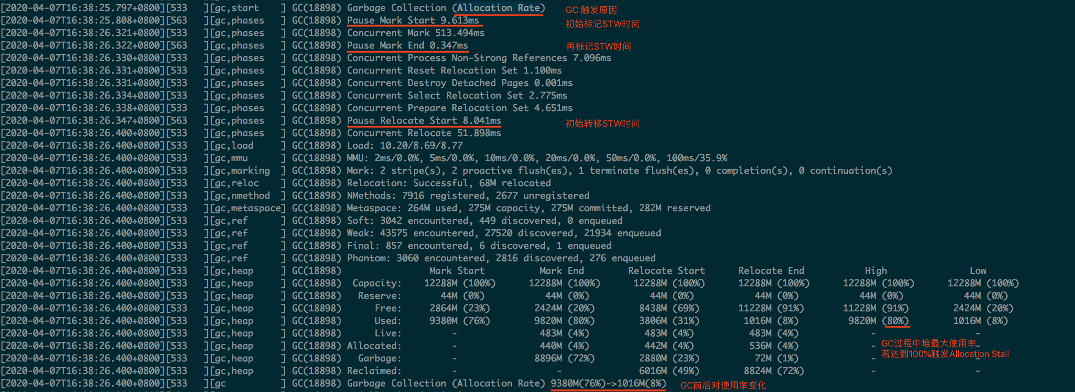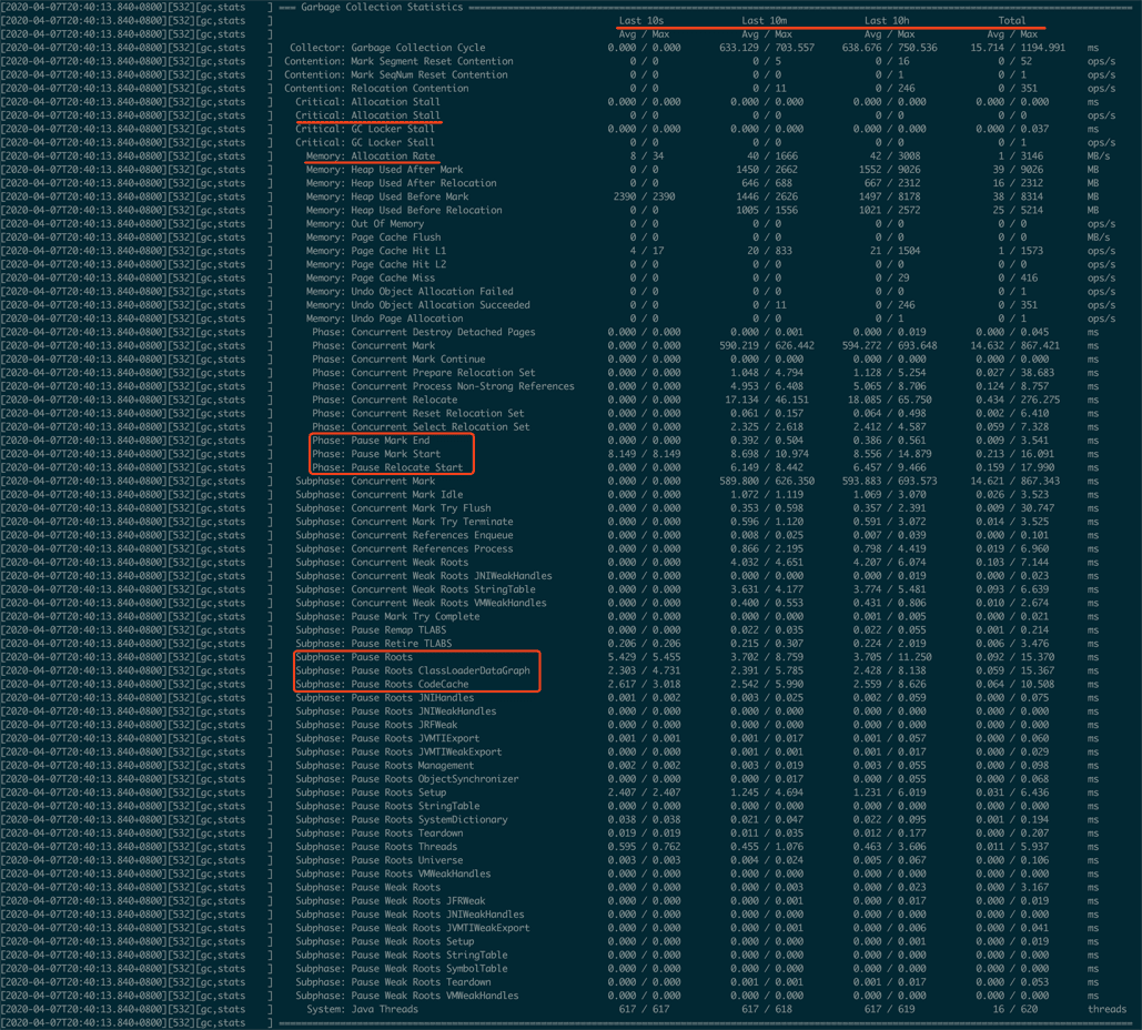 - Heap信息:记录了GC过程中Mark、Relocate前后的堆大小变化状况。High和Low记录了其中的最大值和最小值,我们一般关注High中Used的值,如果达到100%,在GC过程中一定存在内存分配不足的情况,需要调整GC的触发时机,更早或者更快地进行GC。