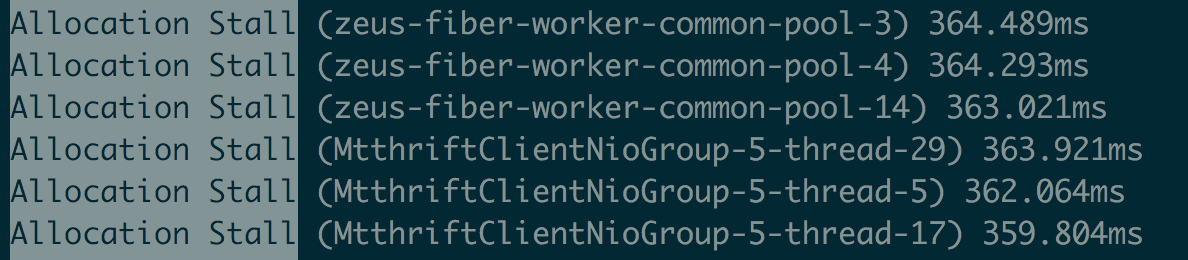 日志信息:对比出现性能毛刺时间点的GC日志和业务日志,发现JVM停顿了较长时间,且停顿时GC日志中有大量的“Allocation Stall”日志。