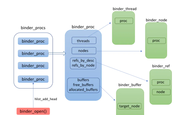 binder 驱动中要实现这些业务功能,必然要用一些数据结构来存放相关数据,比如你上面说 binder_open() 方法时提到的 binder_proc,你还知道其他的结构体吗?