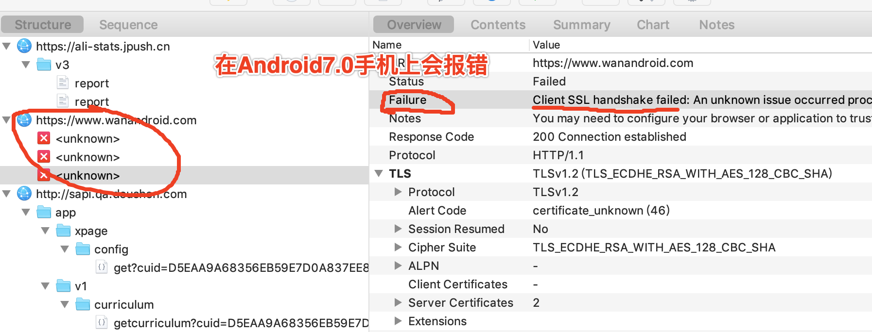• 然后抓包试一下,会发现Android7.0手机之前可以抓包,但是Android7.0之后是无法抓包的