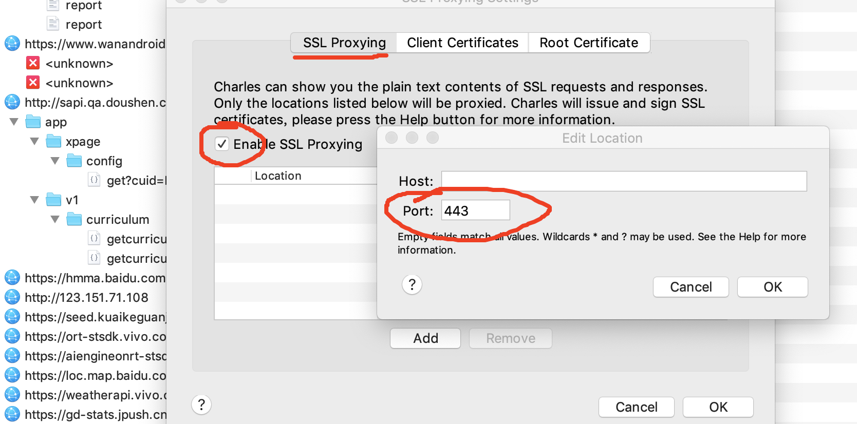 • 第二步设置SSL属性:Proxy ---> SSL Proxy Settings ---> 然后add操作(设置port为443)。如下所示